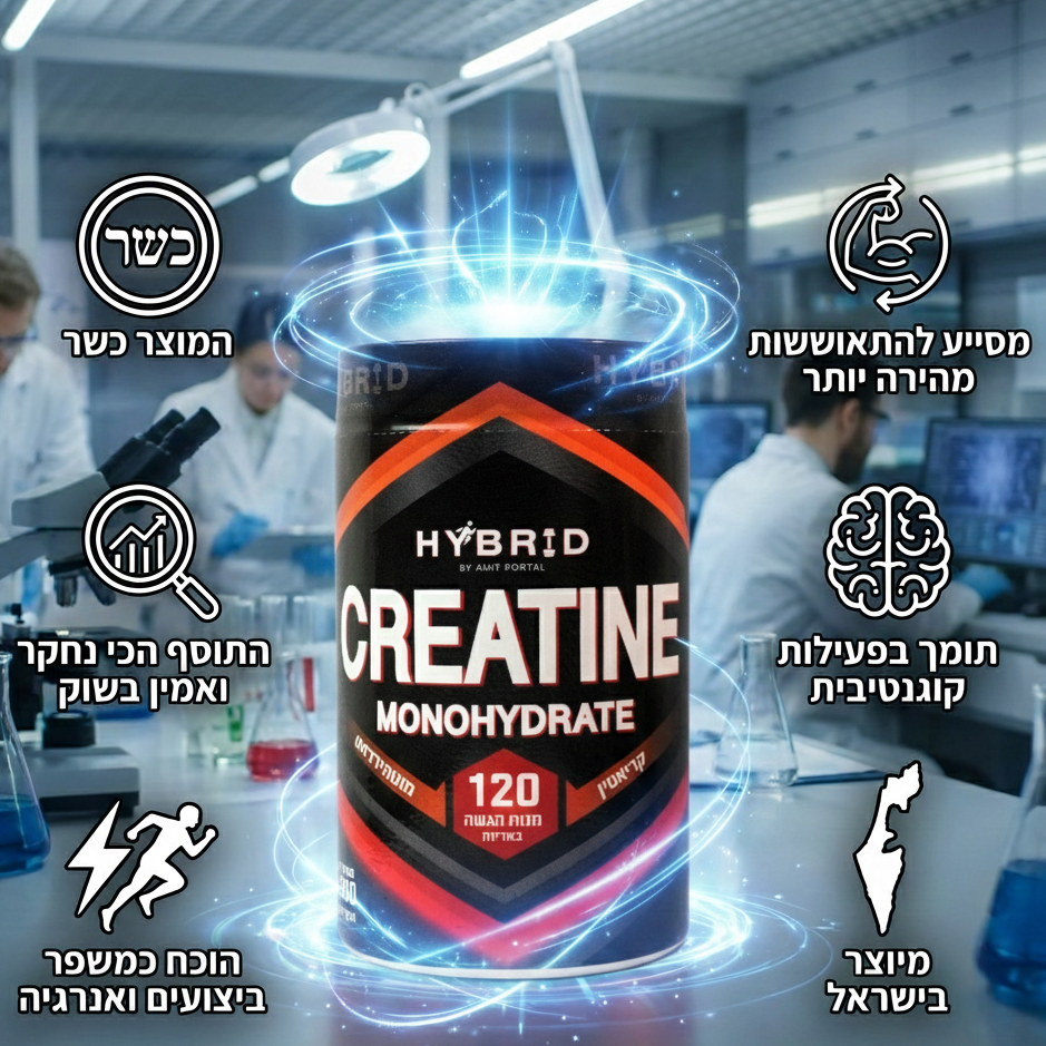 HYBRID CREATINE מיוצר מרכיבים איכותיים עם נוסחה מתקדמת לשיפור הספיגה והביצועים. הוא עובר בקרת איכות קפדנית בישראל ומעניק תוצאות מוחשיות בזמן קצר – יותר כוח, נפח והתאוששות מהירה יותר מאימון לאימון.